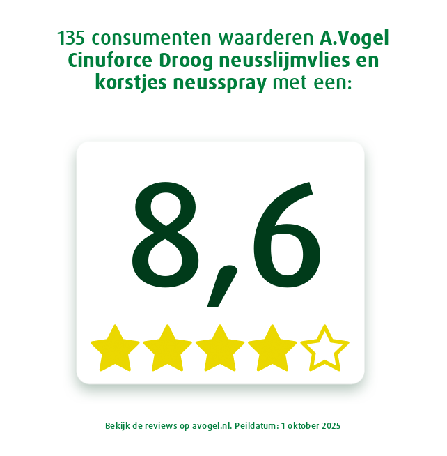 A.Vogel Cinuforce neusspray bij droog neusslijmvlies en korstjes bevat bevochtigende en verzachtende ingrediënten die het neusslijmvlies verzorgen en de genezing van het neusslijmvlies ondersteunen. Het legt een beschermend laagje over het neusslijmvlies dat langdurig vocht aan zich bindt en hierdoor helpt om uitdroging te voorkomen. De 100% natuurlijke ingrediëntenhouden de natuurlijke beschermende functie van de neus intact.