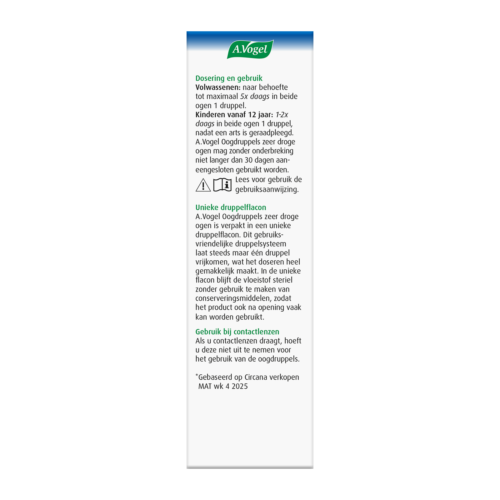 A.Vogel Oogdruppels extra intensief is verpakt in een unieke druppelflacon. Dit gebruiksvriendelijke druppel systeem laat steeds maar één druppel vrijkomen, wat het doseren heel gemakkelijk maakt. In de unieke flacon blijft de vloeistof steriel zonder gebruik te maken van conserveringsmiddelen, zodat het product ook na opening vaak kan worden gebruikt.