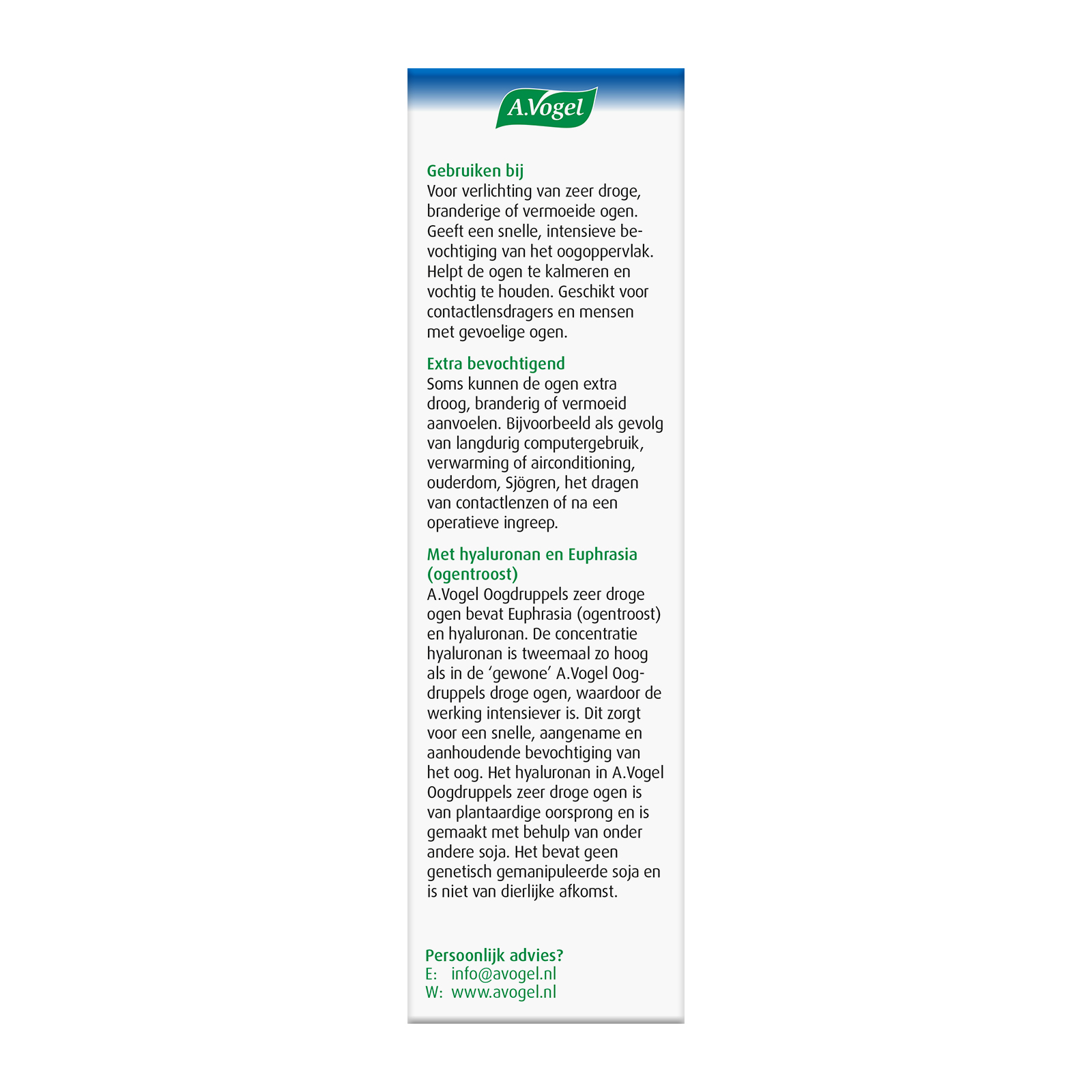 Specialist in oogverzorging - Als je zeer droge of branderige ogen hebt dan geven deze oogdruppels een snelle, intensieve bevochtiging van het oogoppervlak. Het helpt ook bij het behoud van voldoende traanvocht in het oog. A.Vogel Oogdruppels extra intensief is nummer 1 bij droge ogen*.