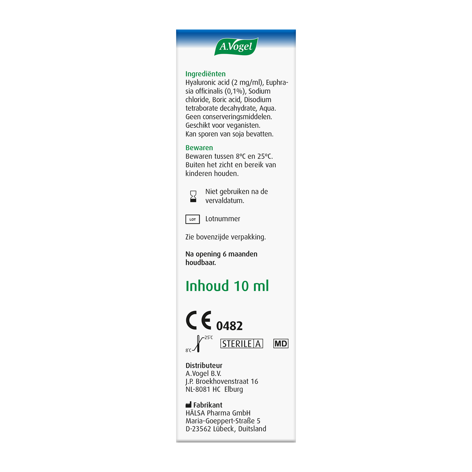 Hyaluronic acid (2 mg/ml), Euphrasia officinalis (ogentroost) (0,1%), Sodium chloride, Boric acid, Disodium tetraborate decahydrate, Aqua. Geen conserveringsmiddelen. Kan sporen van soja bevatten.