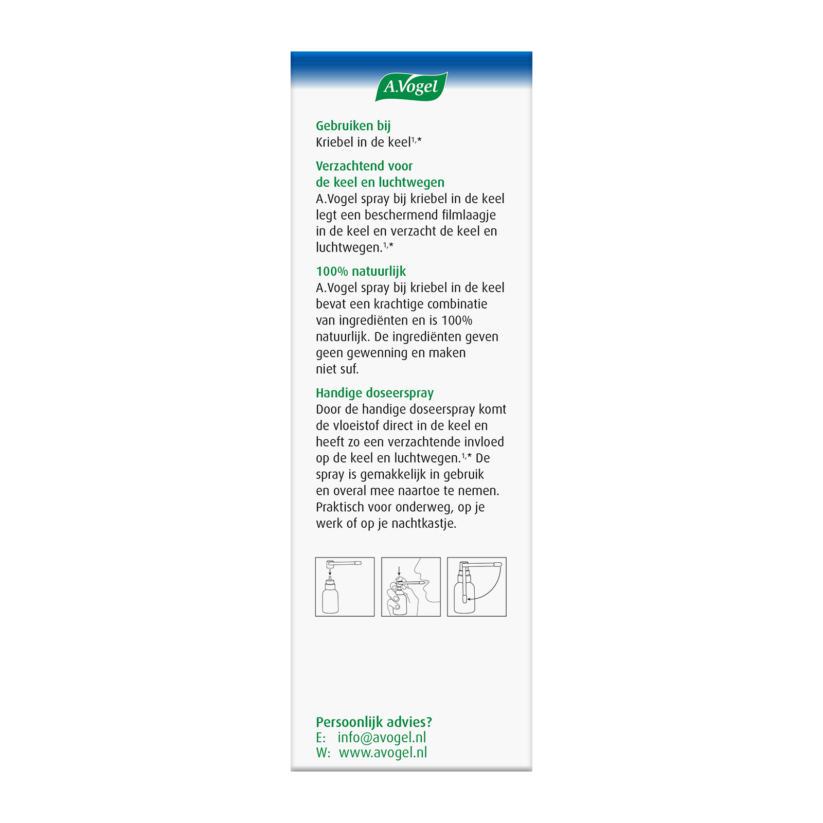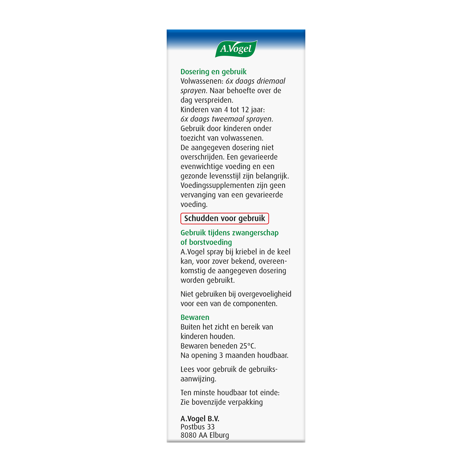 Gebruik tijdens zwangerschap en borstvoeding: A.Vogel spray Kriebel in de keel kan, voor zover bekend, overeenkomstig de aangegeven dosering worden gebruikt.