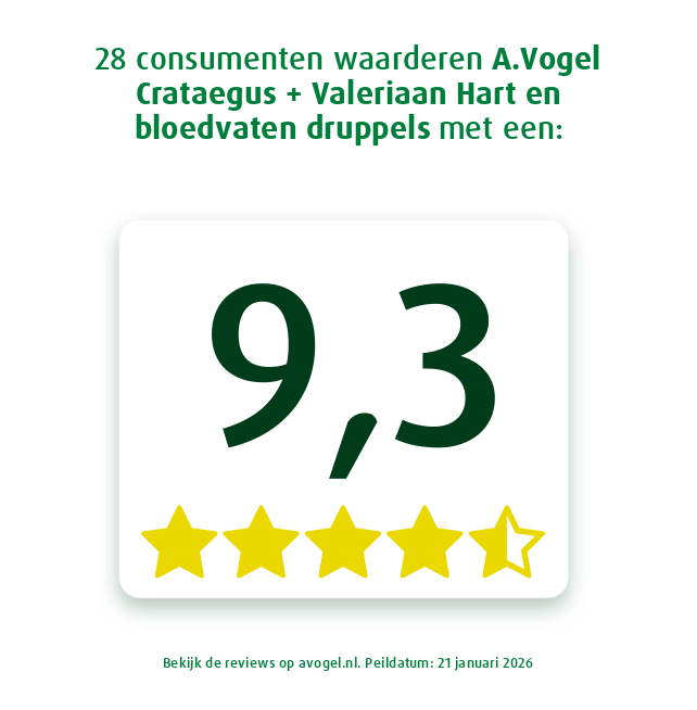 A.Vogel Crataegus + Valeriaan Hart en bloedvaten druppels bevatten Crataegus (meidoorn) en valeriaan, wat natuurlijke hartverzorger zijn*. Het product heeft een gunstige invloed op hart en bloedvaten [1,2]*.