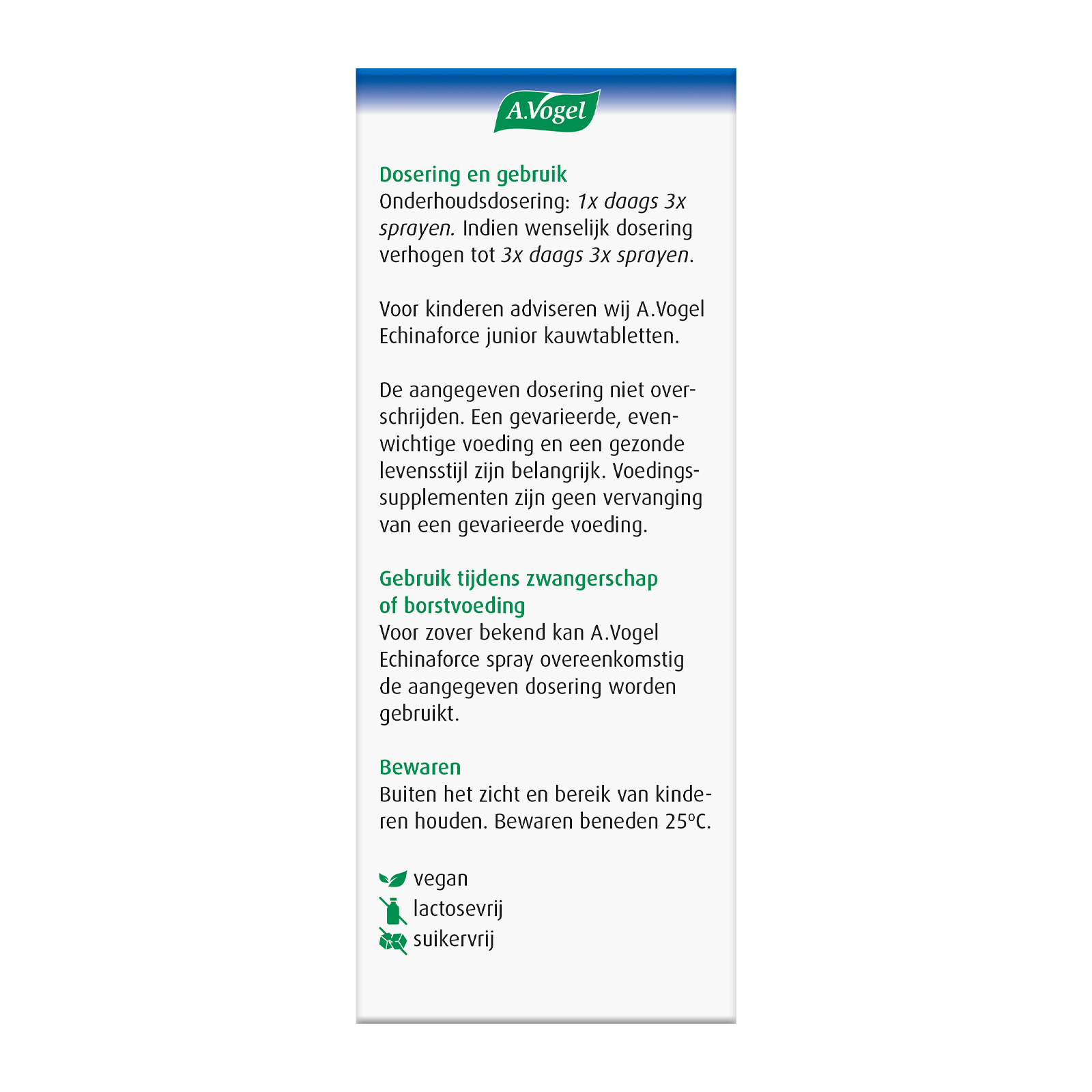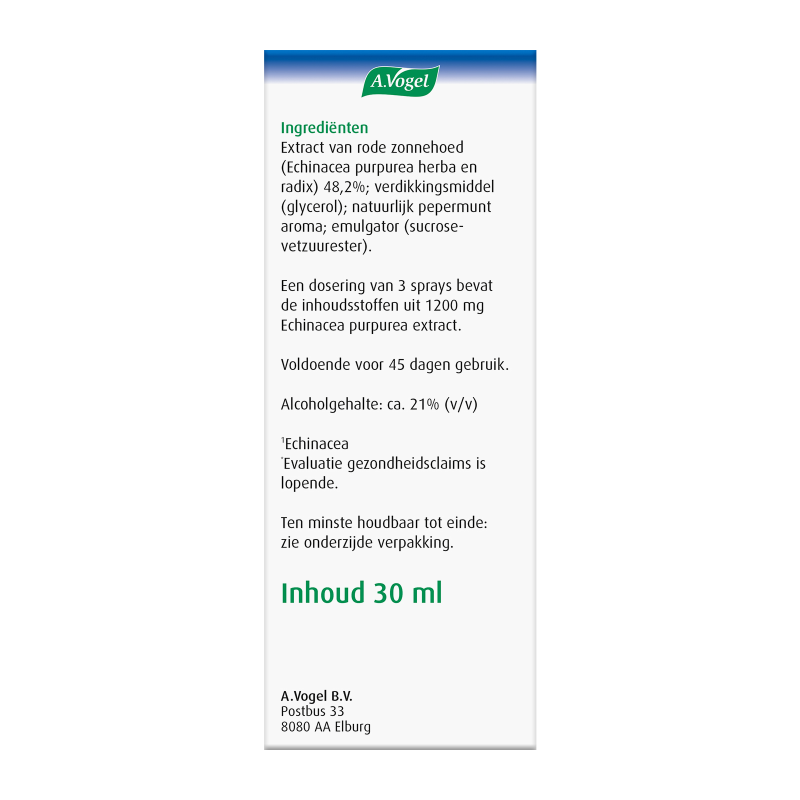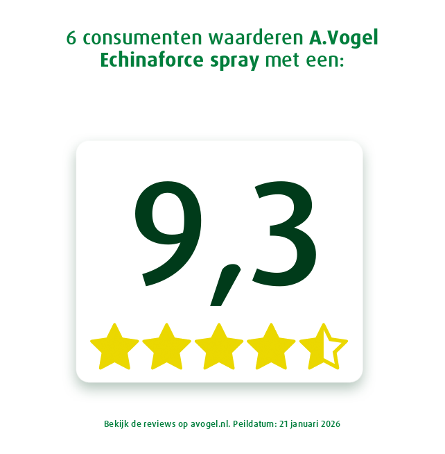 Het immuunsysteem ondersteunt de weerstand van het lichaam. Het behoud van een goed werkend immuunsysteem is belangrijk voor het behoud van een goede gezondheid. A.Vogel Echinaforce spray [1]* helpt de afweer van het lichaam en heeft zo een positieve invloed op het immuunsysteem. Het voordeel van de Echinaforce spray [1]* is dat het vloeibaar is en gelijk op je mondslijmvlies terecht komt. Zo wordt de actieve werkstof snel opgenomen.