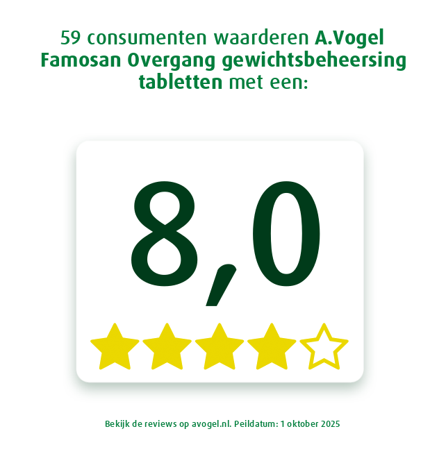 Is het soms wat moeilijker om op gewicht te blijven tijdens de overgang? Kies dan voor Famosan gewichtsbeheersing [2]*. Helpt de vetverbranding [2]* en draagt bij aan een normale stofwisseling van vetten, koolhydraten en eiwitten [3]. Famosan gewichtsbeheersing helpt ook bij het handhaven van de normale balans in de water- en mineralenhuishouding [4]. Tevens ondersteunt het een goede vochthuishouding en vochtbalans [2]* en helpt het bij opvliegers [1]*.