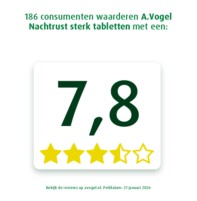 Een goede nachtrust is belangrijk. Net als eten en drinken is goed slapen een basisbehoefte om een goede gezondheid te behouden. Het is nodig om goed te kunnen presteren en te genieten van de dingen die we doen. Een goede nachtrust is echter niet voor iedereen vanzelfsprekend. Zo'n 52% van de Nederlanders kan wel wat extra ondersteuning gebruiken om lekker te slapen [1,2]*. A.Vogel Nachtrust sterk** tabletten ondersteunt je daarbij en helpt bovendien om fris en uitgerust wakker te worden [1,2]*.